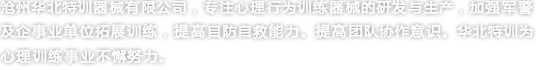 滄州華北特訓(xùn)器械有限公司成立于2002年,是專業(yè)研發(fā)生產(chǎn)心理行為訓(xùn)練器械、拓展器械、拓展器材、攀巖、兒童拓展器械的專業(yè)型企業(yè),并通過ISO-9001質(zhì)量管理體系認證及ISO-14001環(huán)境管理體系認證,致力于各職業(yè)群體提供的心理行為訓(xùn)練器械、拓展器械、攀巖、兒童拓展器械等設(shè)備,使之不斷提升心理健康水平、充分開發(fā)自我潛能。我公司竭誠為廣大客戶提供專業(yè)化各類心理行為訓(xùn)練器械相關(guān)產(chǎn)品和服務(wù)。
